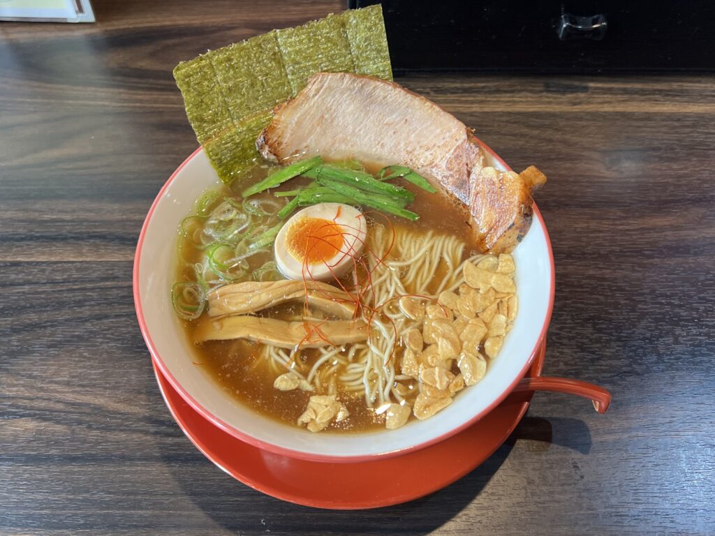 トッピングとして、焼き海苔、ネギ、卵、メンマ、赤唐辛子、そして写真ではチャーシューのように見えますが鶏の薄切り肉がのっています。麺は中細麺です。
